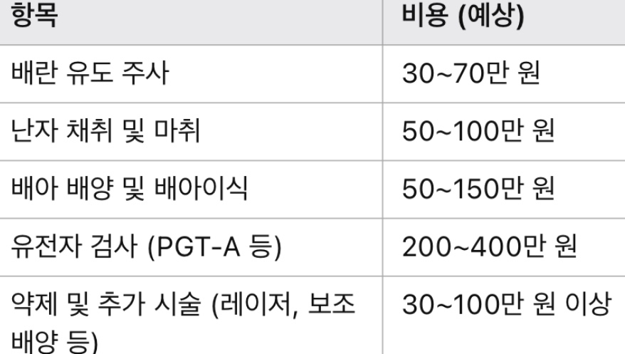 실제로 다음은 IVF 한 주기에 소요되는 대략적인 비급여 항목 예시입니다.