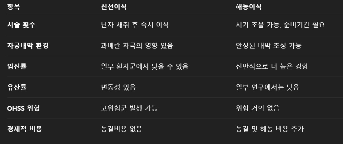 궁극적으로는 생식의학 전문가의 세심한 판단 아래, 신선이식과 해동이식의 특성을 충분히 이해하고 환자 맞춤형 전략을 세우는 것이 가장 바람직한 접근이라고 할 수 있습니다.