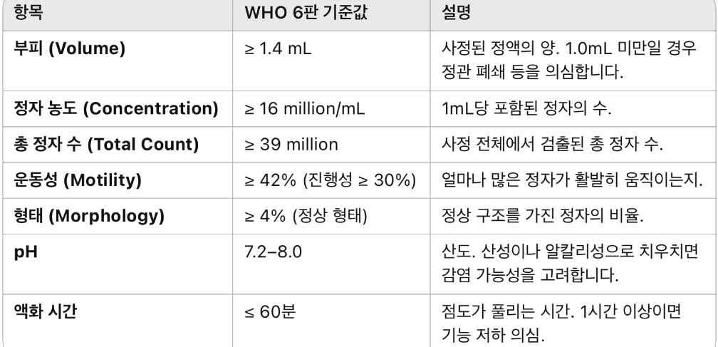 이 기준은 모두 ‘정상 하한값’으로, 이 수치를 넘지 못한다고 해서 반드시 난임이라고 단정할 수는 없습니다.