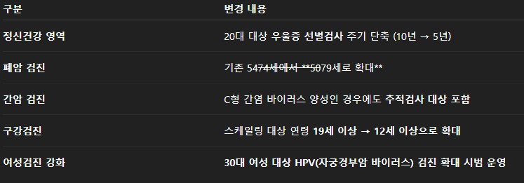 - 2025년 건강검진은 정신건강·폐암·간암 항목이 확대/강화됨