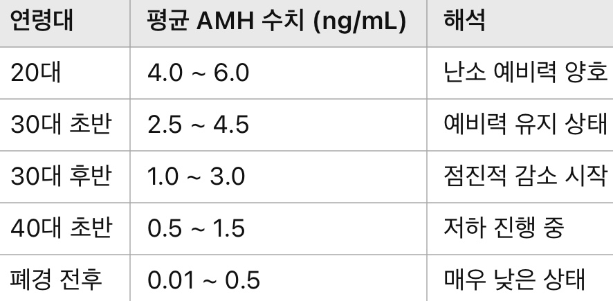 보통 1.0 ng/mL 미만이면 난소기능저하(Diminished Ovarian Reserve, DOR)를 의심하며,